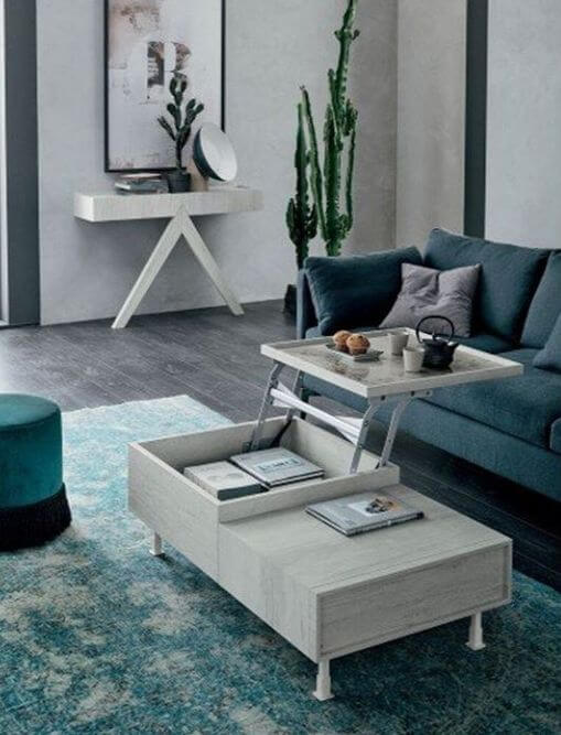 - Hay mesas de centro que se pueden abrir, o tienen compartimentos para guardar cosas como mantas o ropa de cama.
